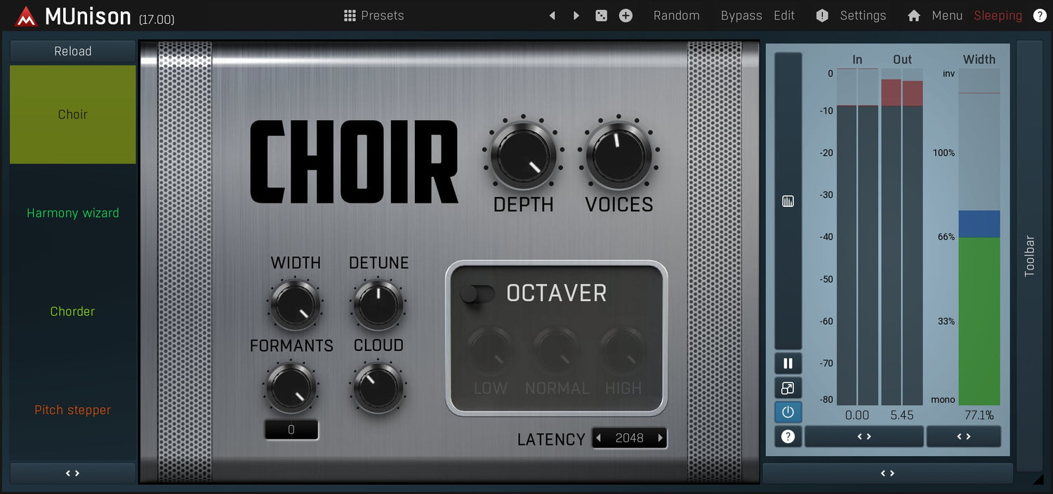 MUnison est une combinaison unique de doubler/unison et d'harmoniseur intelligent. Il permet à vos voix de sonner comme un orchestre avec des harmonies automatiquement ajustées, produit un effet de double suivi classique et bien plus encore...