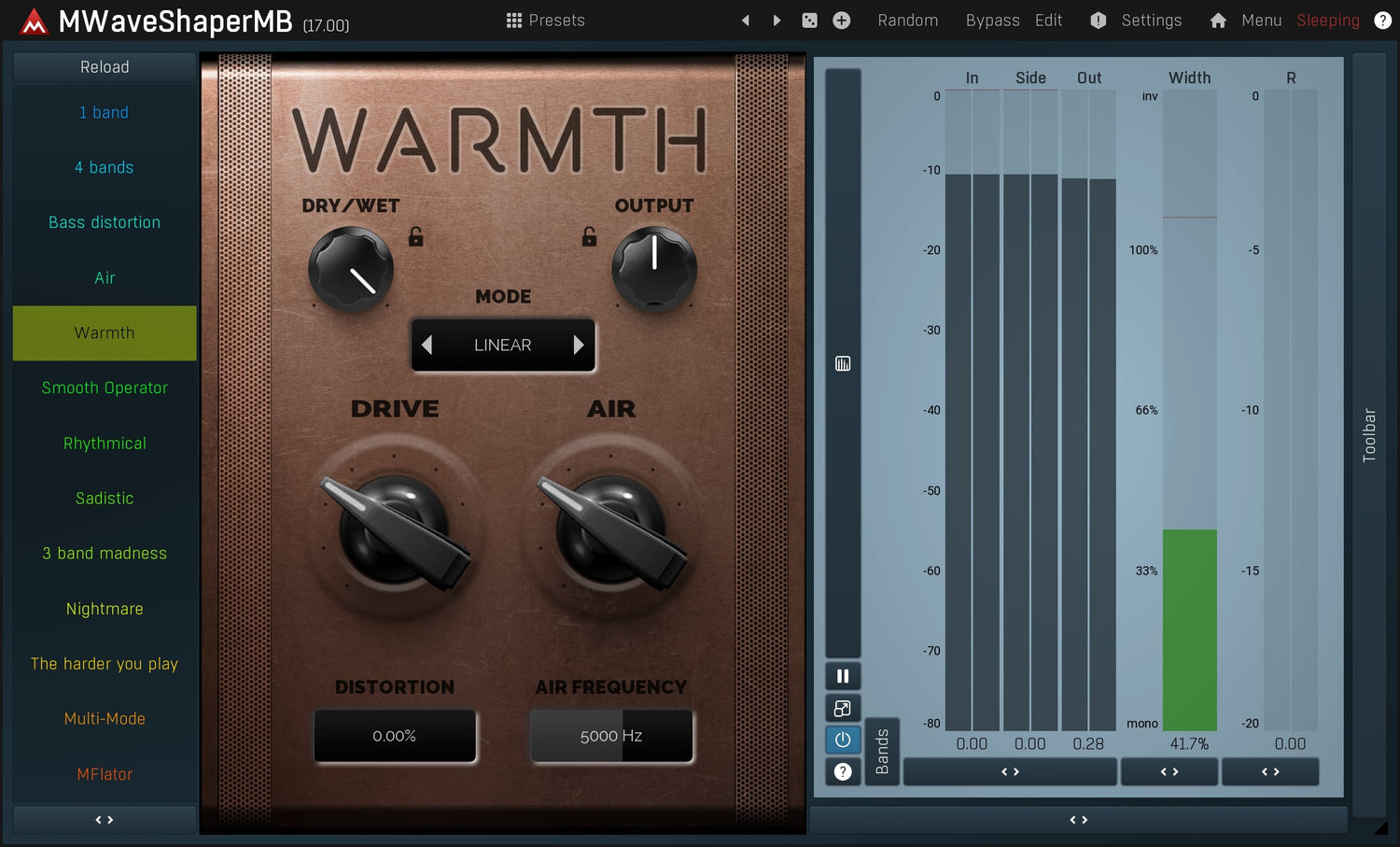 La transformation d'un signal large bande peut être utile, mais elle est généralement trop écrasante et ne vous offre pas beaucoup d'options. MWaveShaperMB vous permet de diviser le signal d'entrée en jusqu'à 6 bandes et d'utiliser une forme personnalisée différente dans chacune d'elles. Vous pouvez même moduler les formes pour une véritable folie distordue.