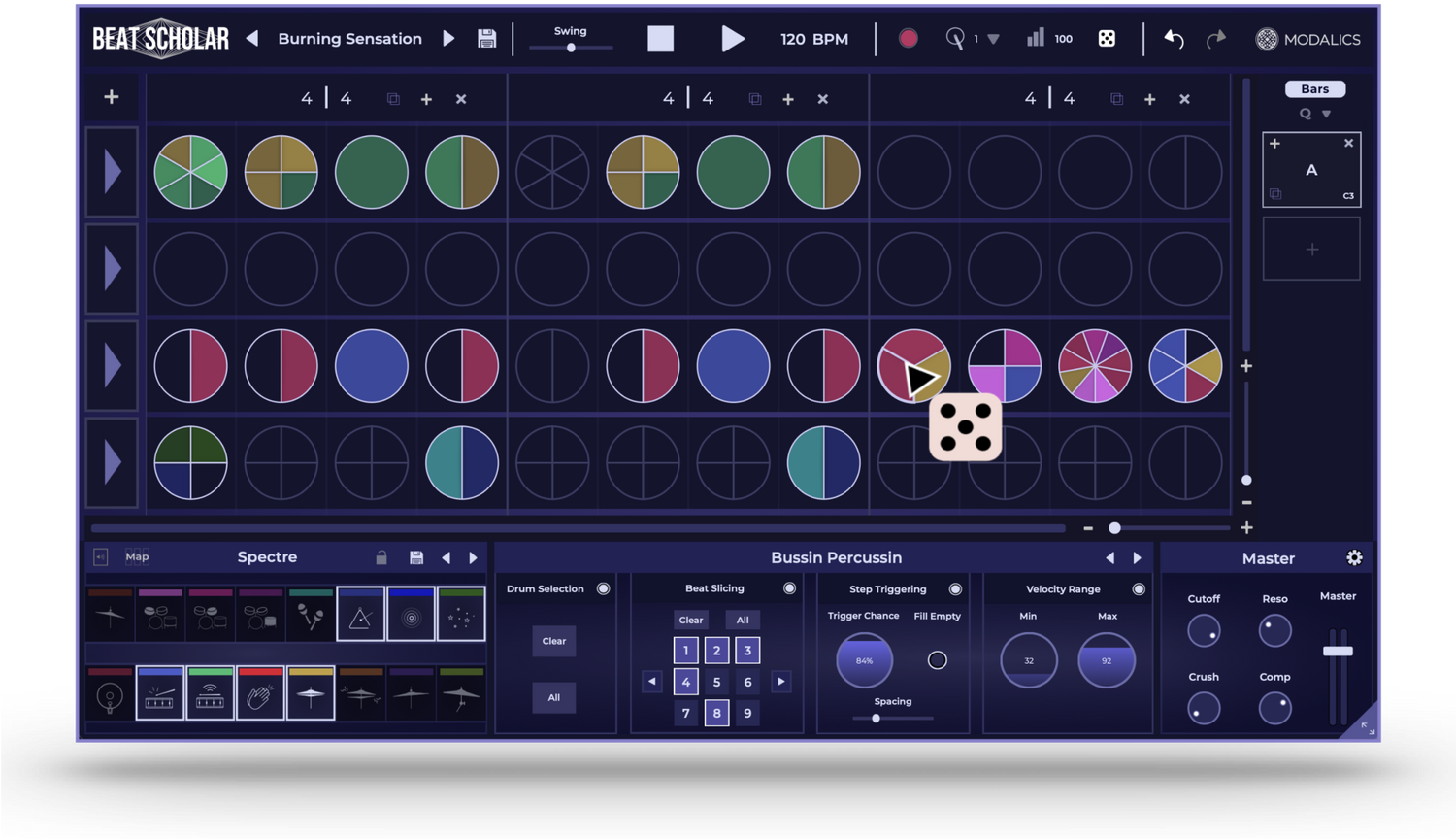 Notre méthode de visualisation unique représente chaque beat comme un cercle (ou pizza...) vous permettant de le découper en jusqu'à 42 tranches. Cette approche innovante révèle non seulement de nouvelles dimensions de possibilités rythmiques, mais brise également les paradigmes traditionnels en vous permettant de placer n'importe quelle batterie sur n'importe quelle tranche.