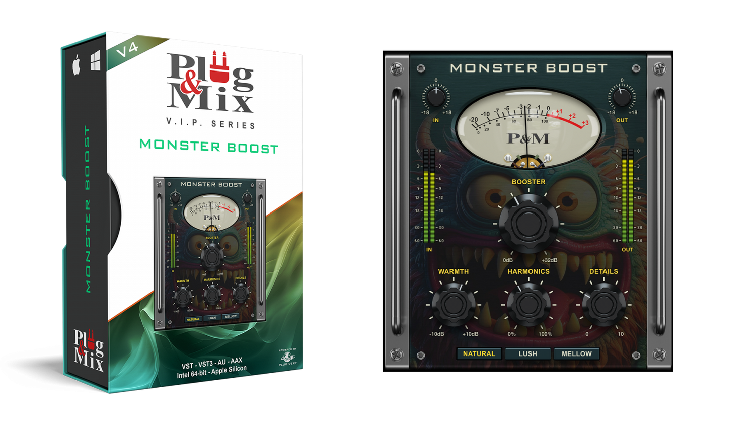 Unleash bold harmonics and rich, warm tone with Monster Boost, a signal booster plugin designed to add punch and brilliance to any track. With Booster, Warmth, Harmonics, and Details controls, Monster Boost is perfect for enhancing drums, vocals, and entire mixes, giving them a polished, impactful sound.