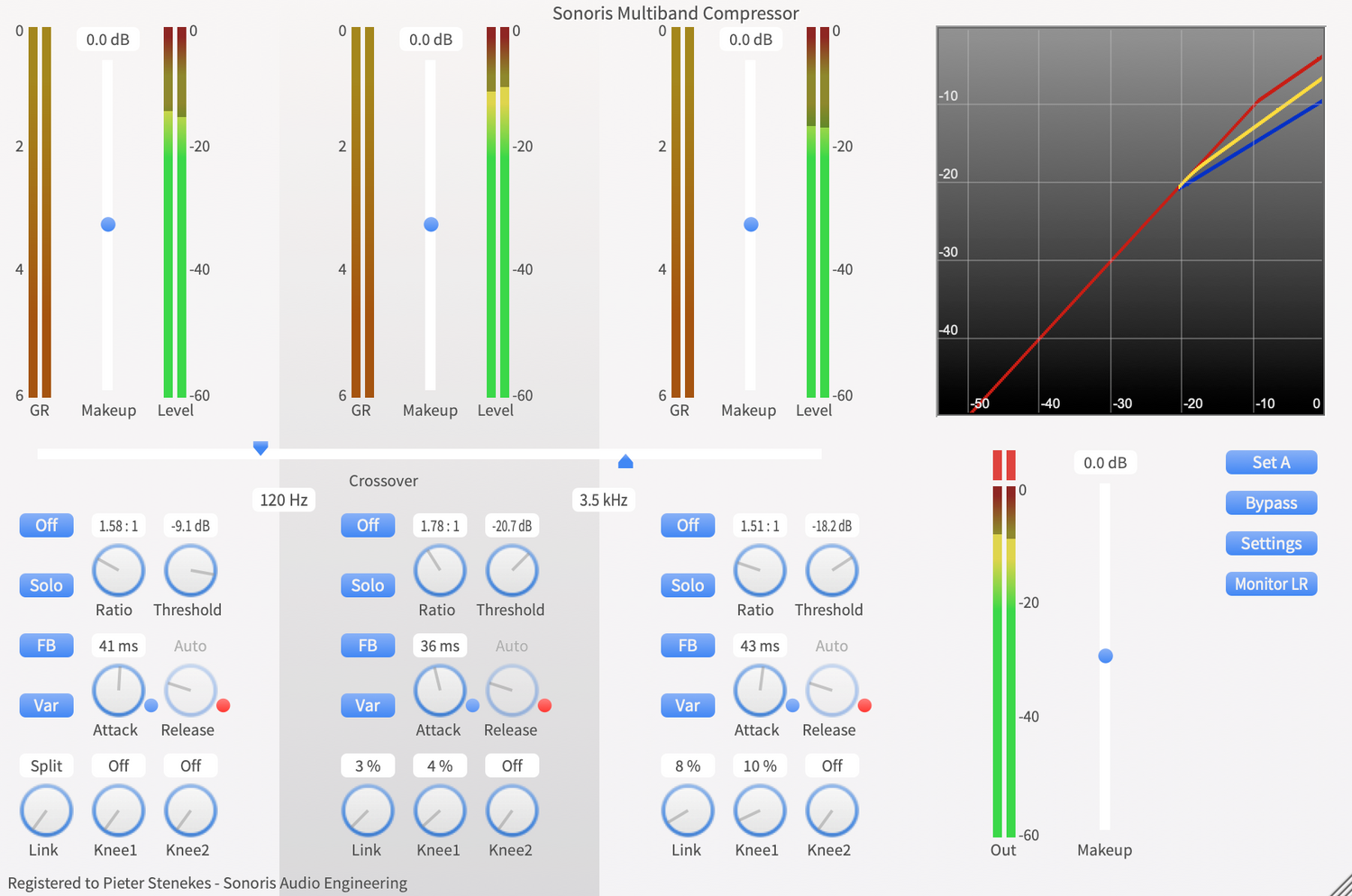Sonoris Multiband Compressor (=SMBC) est un compresseur polyvalent à trois bandes aux formats VST, VST3, AU, AAX et RTAS pour Windows et Mac. Il s’agit d’un processeur ultra propre, parfaitement adapté aux contenus délicats. Il dispose de trois bandes de fréquences indépendantes, chacune suivie d’un compresseur basé sur Sonoris Mastering Compressor. Les trois bandes sont créées à l’aide de filtres de crossover Linkwitz-Riley soigneusement conçus afin d’éviter les problèmes d’annulation de phase, tout en offrant une qualité très naturelle, proche de l’analogique. Par conception, elles se recombinent à plat. Contrairement aux filtres à phase linéaire, elles n’introduisent pas d’artéfacts de ringing et sont plus efficaces à l’usage.