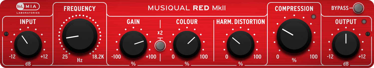 Musiqual Red’s Compressor is specifically tuned to complement the Tube character of this unit. It has fixed attack and release settings and allows for easy control of the amount of compression applied to the sound.