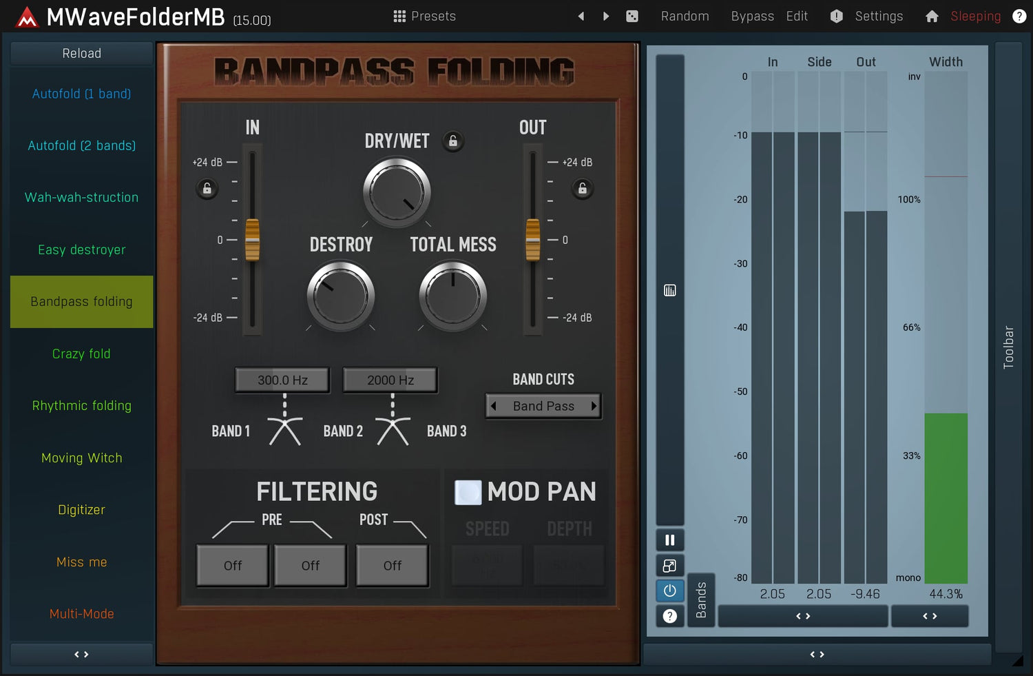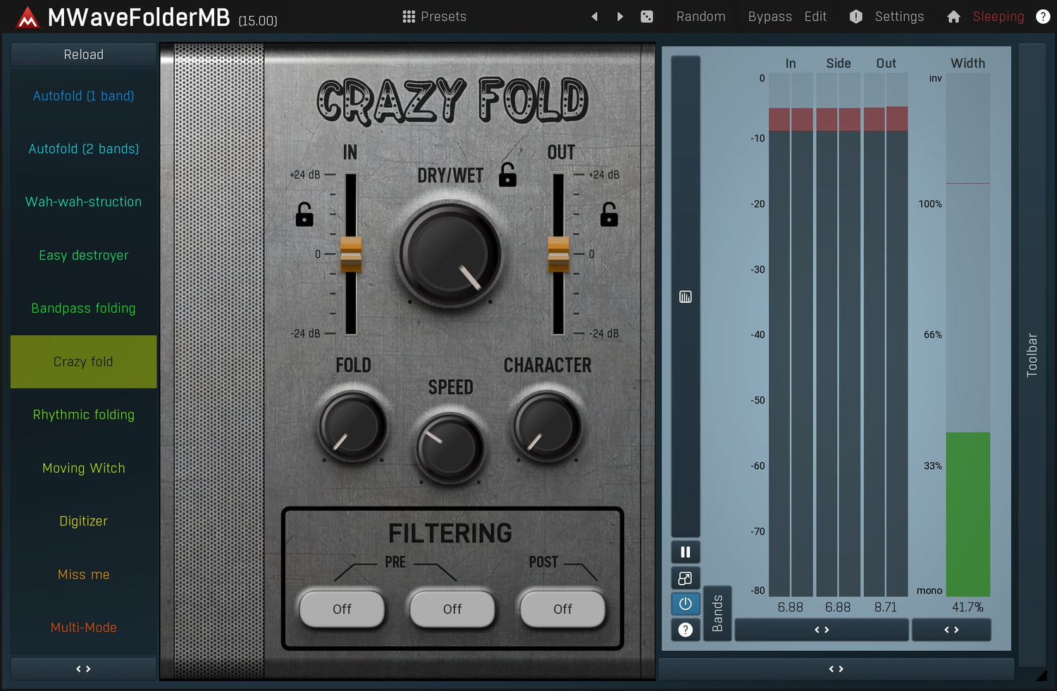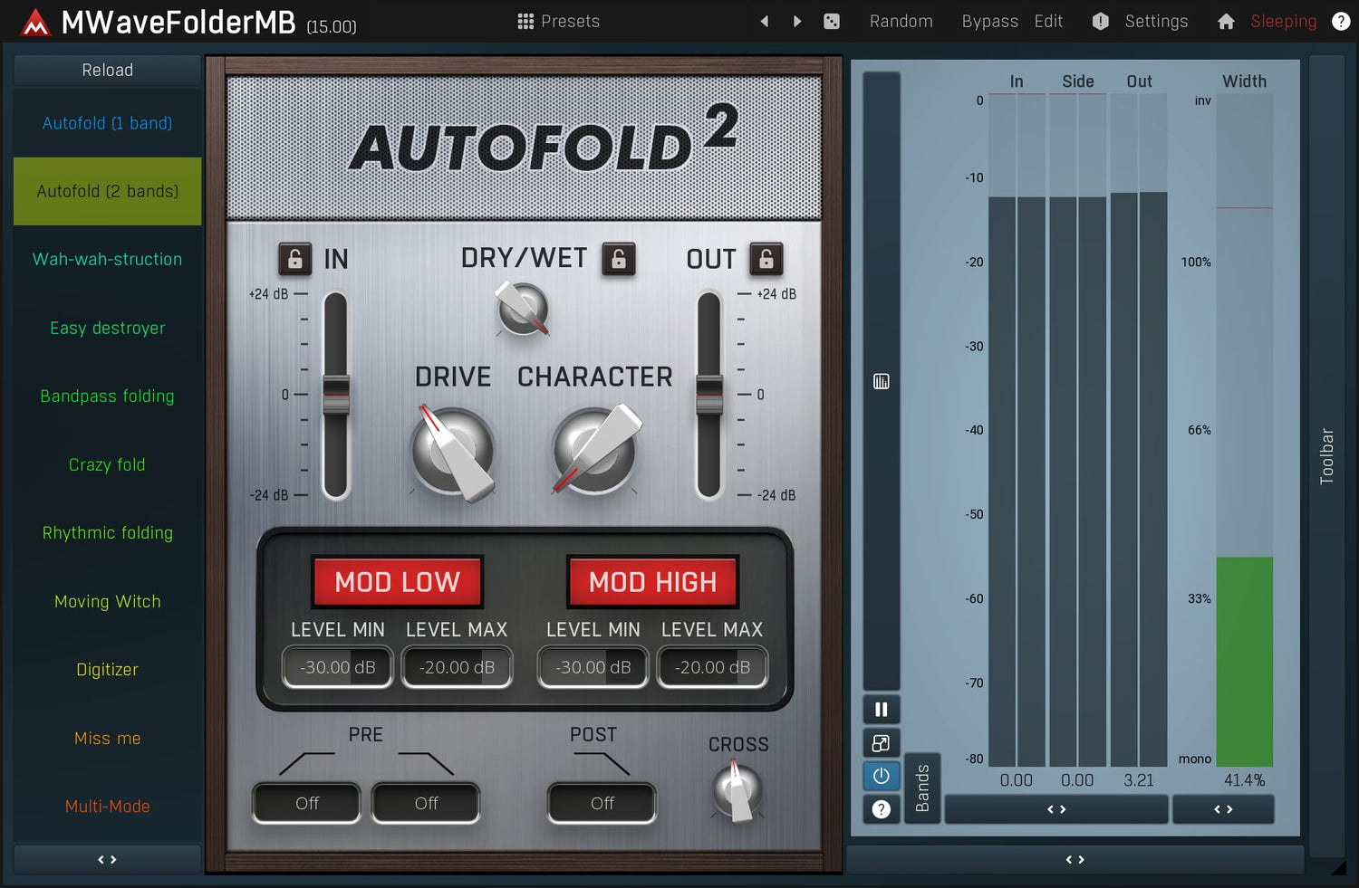 MMultiBandWaveFolder is a powerful distortion module, inspired by analog, taken to a whole new level using digital processing. It has a unique character ranging from mild harmonic enhancement to a complete sound destruction.