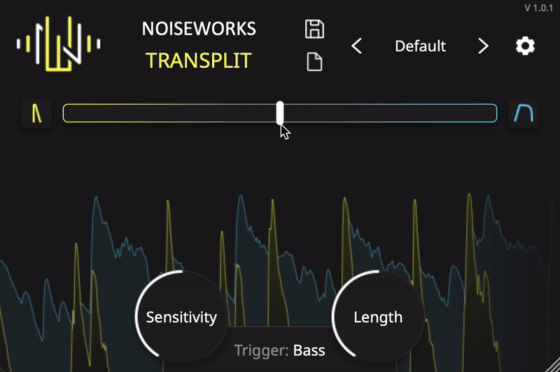 Le curseur détermine l'équilibre du volume entre Punch et Body. La sensibilité contrôle à quel point les dynamiques sont capturées en détail. La longueur définit le fondu des transitoires détectés (jaune), et le Trigger permet d'établir un focus de fréquence. De cette manière, le focus peut être déplacé davantage vers le kick ou davantage vers les crashes.