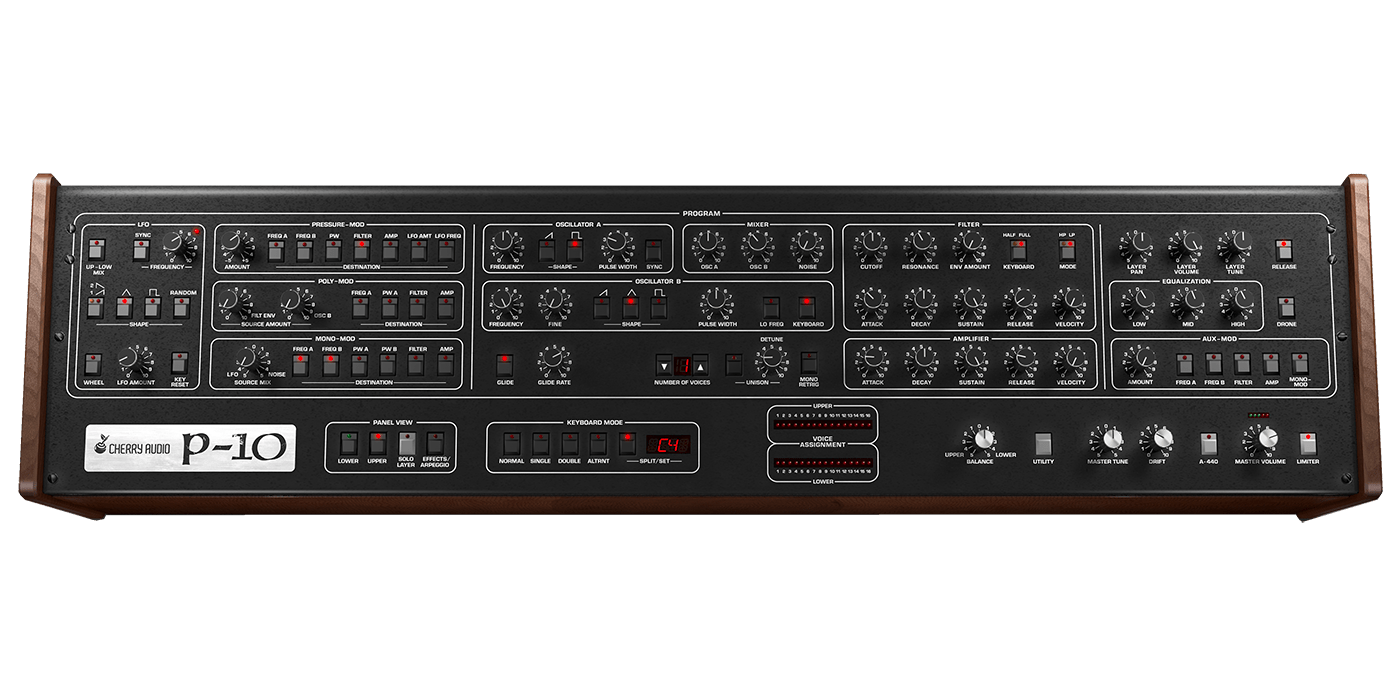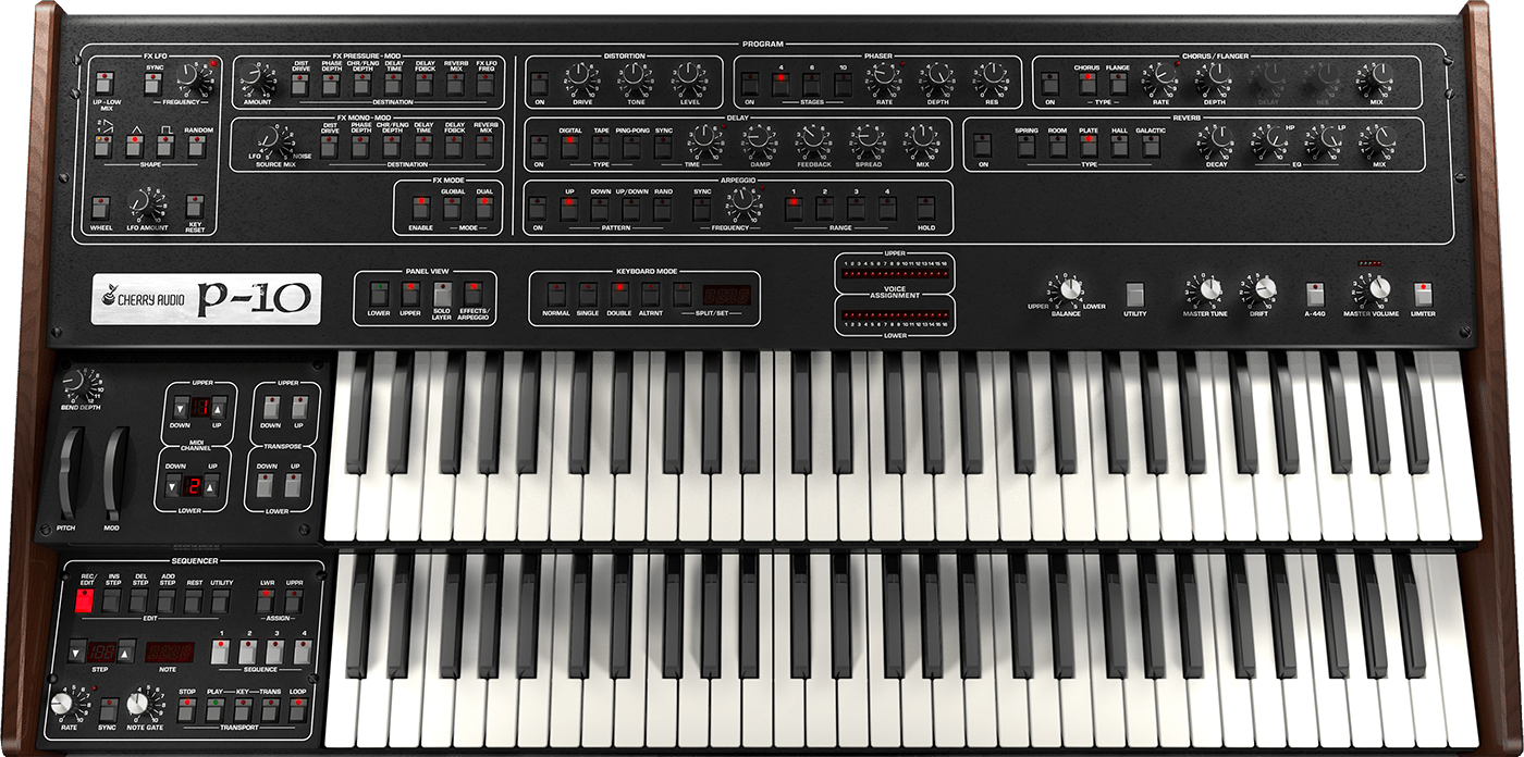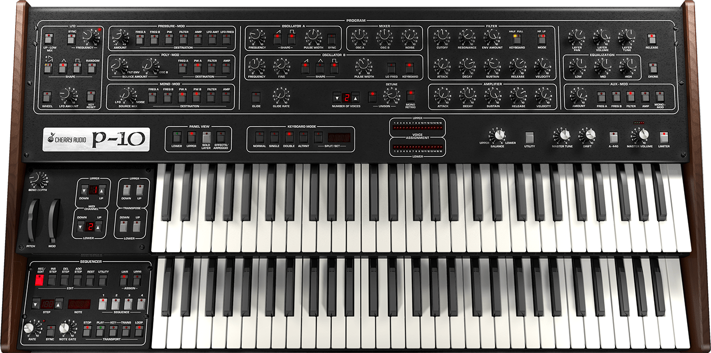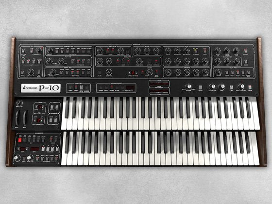 Le P-10 de Cherry Audio est basé sur l'un des synthétiseurs analogiques polyphoniques phares les plus désirables jamais créés. Sorti par SCI en 1980, l'instrument original était essentiellement deux des révolutionnaires synthétiseurs programmables P5 dans un énorme boîtier à double manuel, plus un "séquenceur polyphonique" intégré dans le panneau inférieur. Il pouvait être configuré pour jouer comme deux synthétiseurs indépendants à cinq voix, un seul synthétiseur à dix voix, en couches de patchs doubles, ou en alternant entre les couches avec chaque pression de touche.