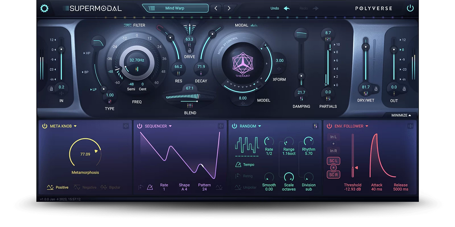 Supermodal est un filtre modal avec des capacités de conception sonore inégalées. C'est un "Meta-filter" qui utilise des centaines de filtres passe-bande d'une précision chirurgicale pour modéliser les caractéristiques résonnantes de divers objets.