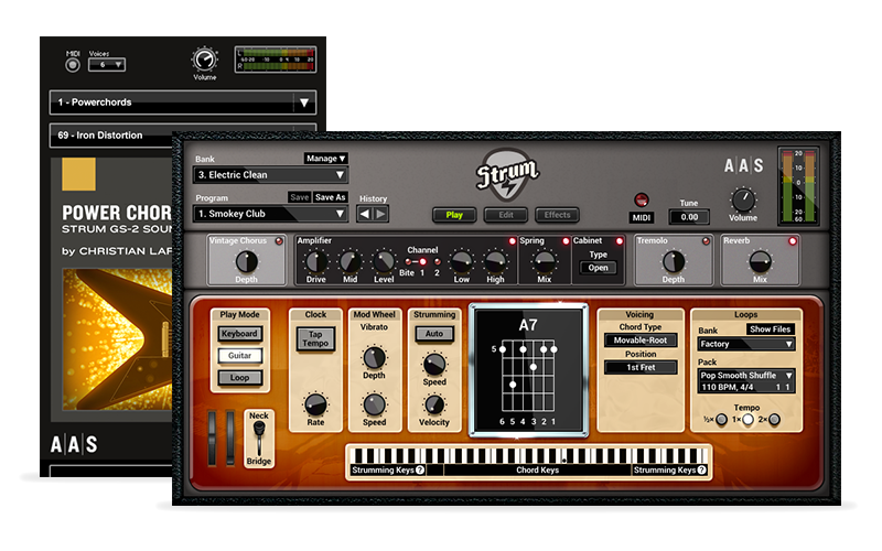 Resident sound designer Christian Laffitte infuses high energy into Strum GS-2 with his new sound pack, Power Chords. Featuring 13 styles, 92 guitar presets, and 93 strumming patterns playable with your own chord progressions. From Classic Rock to Metal to Industrial, Power Chords fits a variety of production flavors supercharged with attitude. Ranging from sparkly clean sounds all the way up to high-gain territory, Power Chords gives you plenty of chugging action to rock out on your next endeavor.