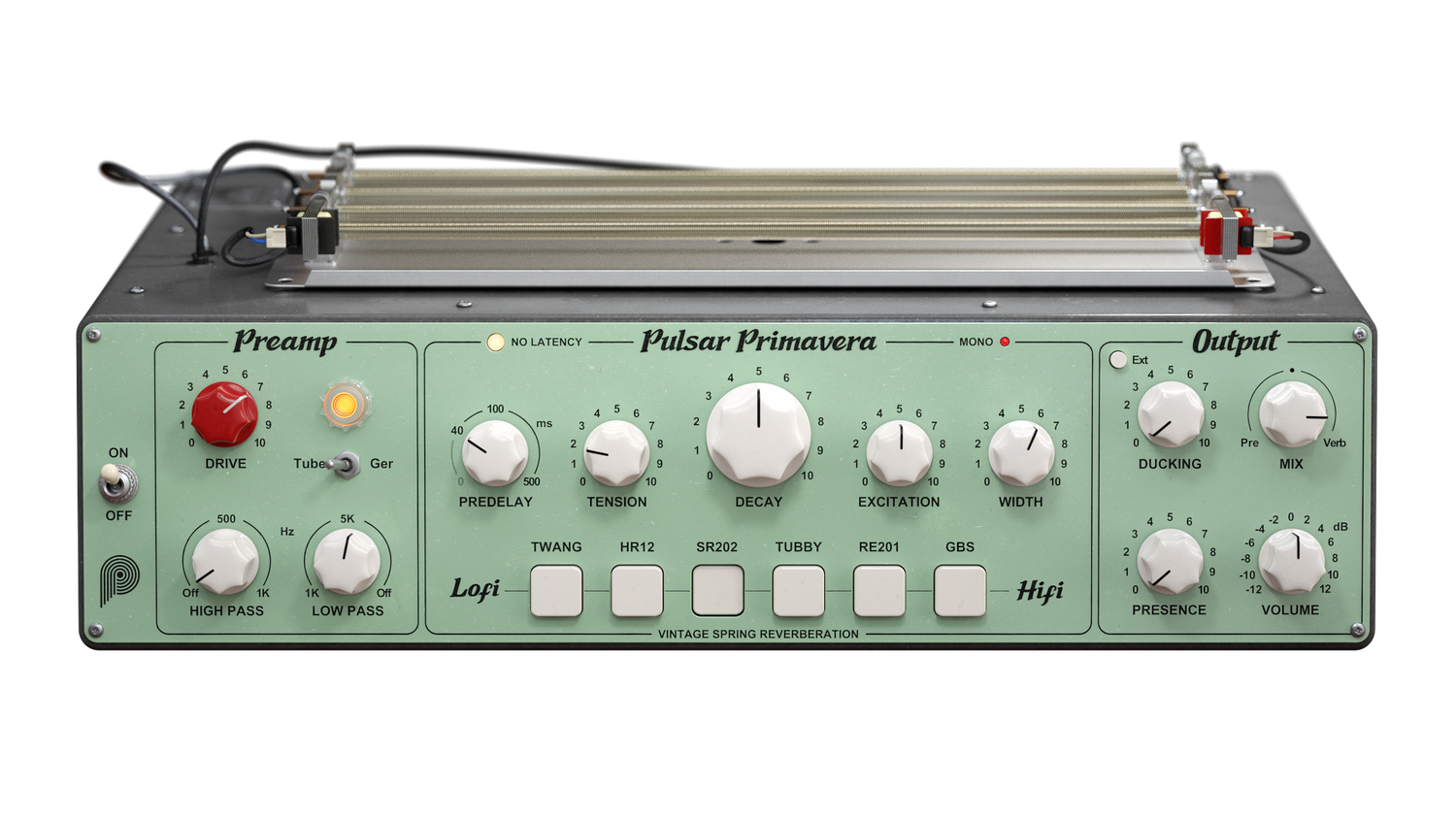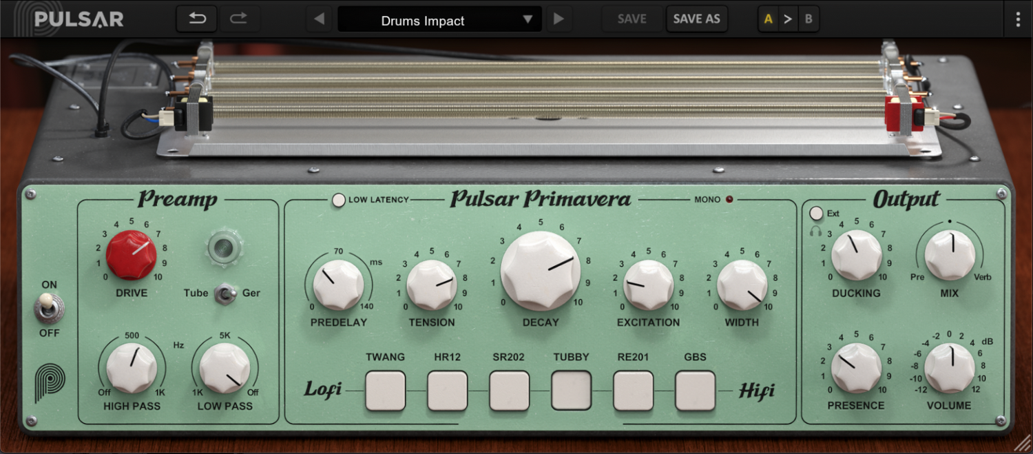 Pulsar Primavera is a 6-in-1 reverberation plugin that includes devices heard on countless hits throughout the ages. From lo-fi to hi-fi, each tank precisely emulates the original units' electronic and mechanical behavior. Furthermore, exclusive spring tension and excitation controls offer a wider sound palette than typical convolution models.
