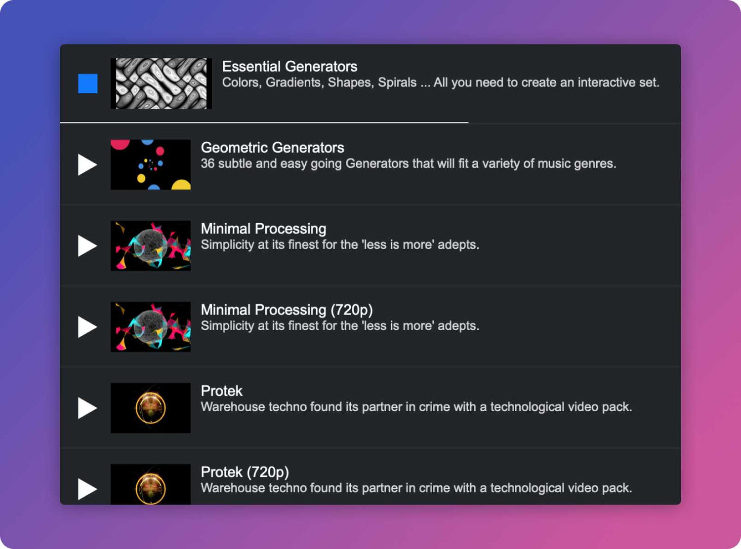 • 144 royalty-free professional video samples (available in 404p, 720p & 1080p) • 36 royalty-free professional audio samples • Generators: includes 48 real-time generated & audio reactive glsl files • Overlays: includes 13 transparent background video samples