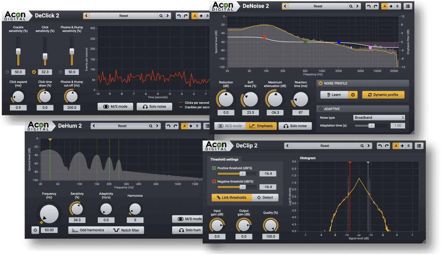 Découvrez notre Restoration Suite, une collection révolutionnaire de quatre plugins avancés de restauration audio conçus pour redonner vie à vos enregistrements ! Que vous soyez confronté à des sifflements, du bruit de vent, des bourdonnements, des grésillements, des clics ou d'autres bruits indésirables, cette suite est faite pour vous.