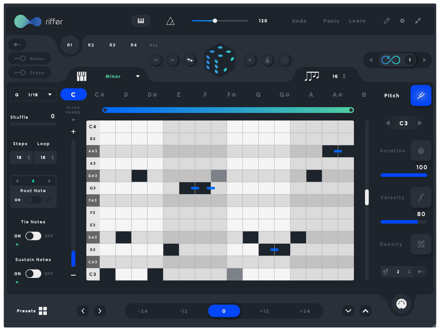 Riffer est un outil MIDI intelligent qui génère des Riffs & Séquences musicales en combinant Pitch, Duration, Velocity & Density. Conçu pour vos sons, Software & Hardware. Transformez-les en quelque chose de personnel ou laissez-le fonctionner sans fin en utilisant le mode d'infini.