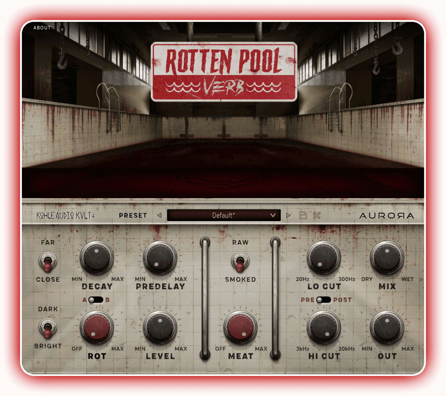 Le ROTTEN POOL VERB combine deux sections de réverbération avec un filtre et une distorsion savoureuse. Vous pouvez mélanger la réverbération hautement diffuse de la grande piscine avec une réverbération courte de claquement provenant des vestiaires de la piscine. Vous pouvez créer de beaux espaces luxuriants avec la grande réverbération, vous pouvez épaissir vos percussions avec celle des vestiaires ou créer l'ambiance la plus sale et effrayante avec une seule clic !