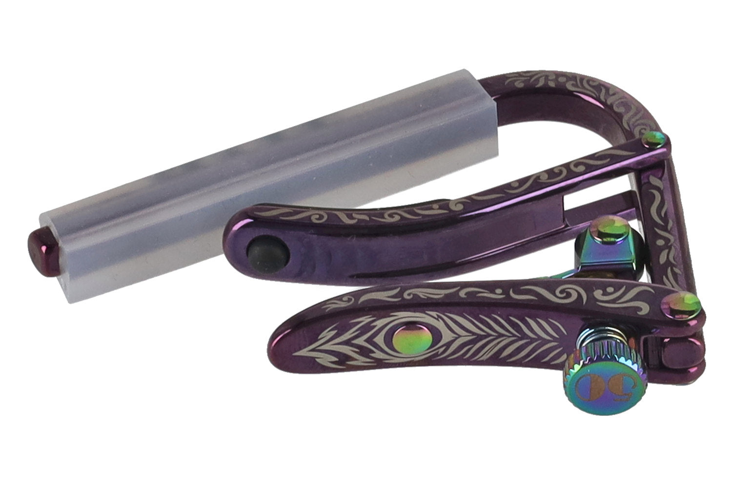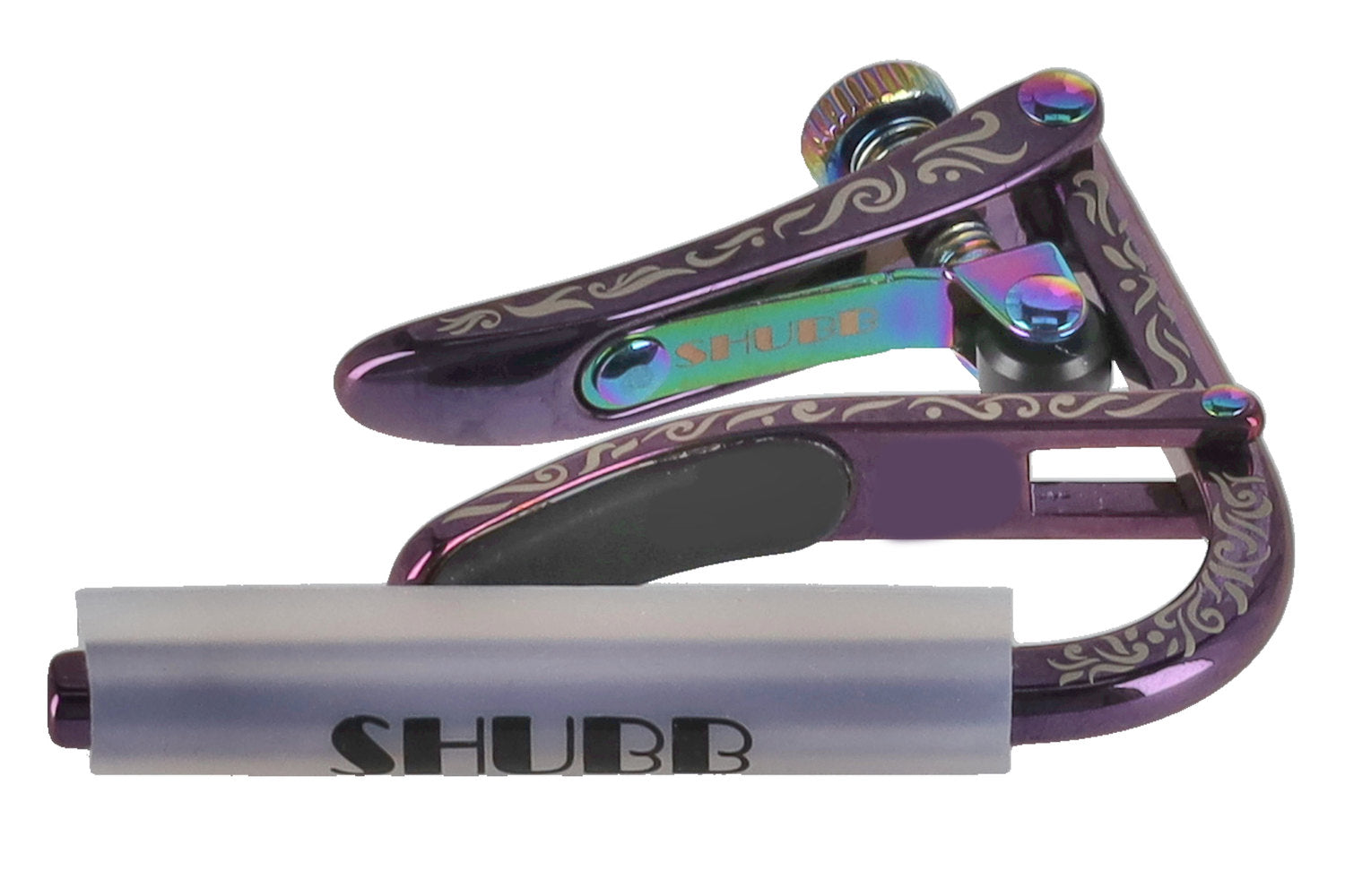 • The Shubb Violet Sky Anniversary Edition Capos feature laser etched embellishments on a deep, rich violet background. Our durable “Royale” titanium finish has been used. Multicoloured fittings provide a very dazzling effect.