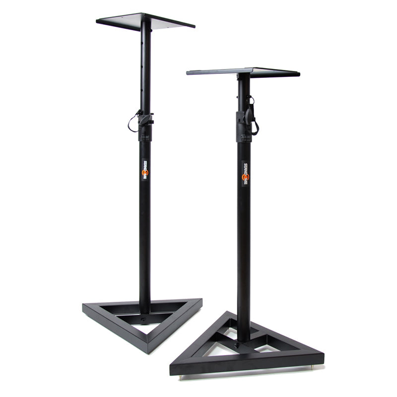 Toppladen er udstyret med skridsikre skumstrips, der beskytter dine monitorer mod ridser, reducerer vibrationer og holder højttalerne sikkert på plads. Den trekantede base giver god stabilitet, og stativerne leveres med både gummifødder og metalspikes, så de kan bruges på både hårde gulve og tæpper.