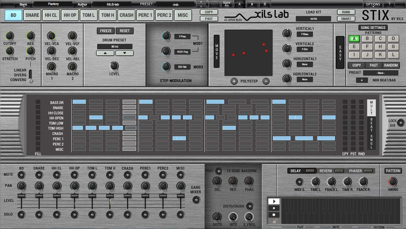 - The Effects : Analog Delay and Phaser emulation. Natural Reverb, and a per drum Crusher/Distorsion unit.