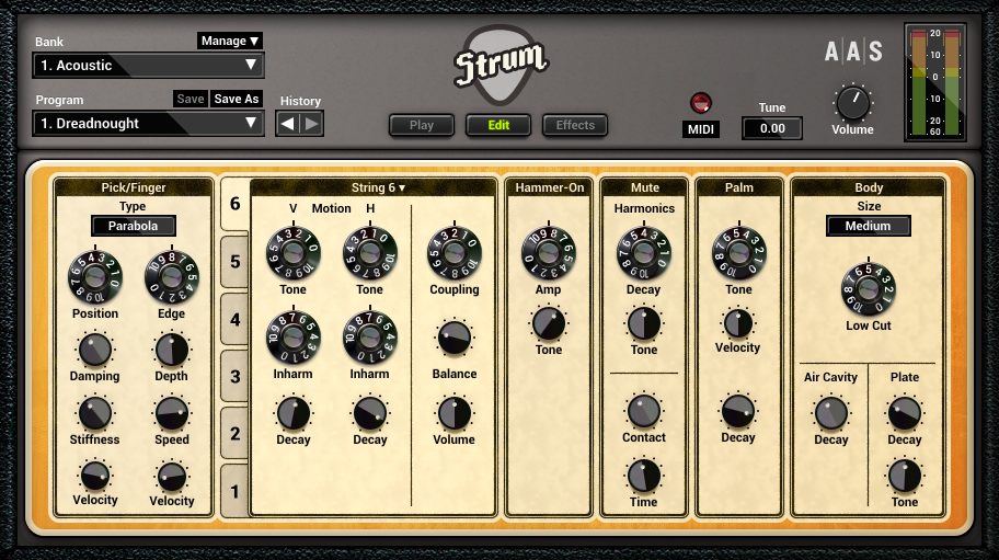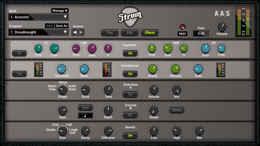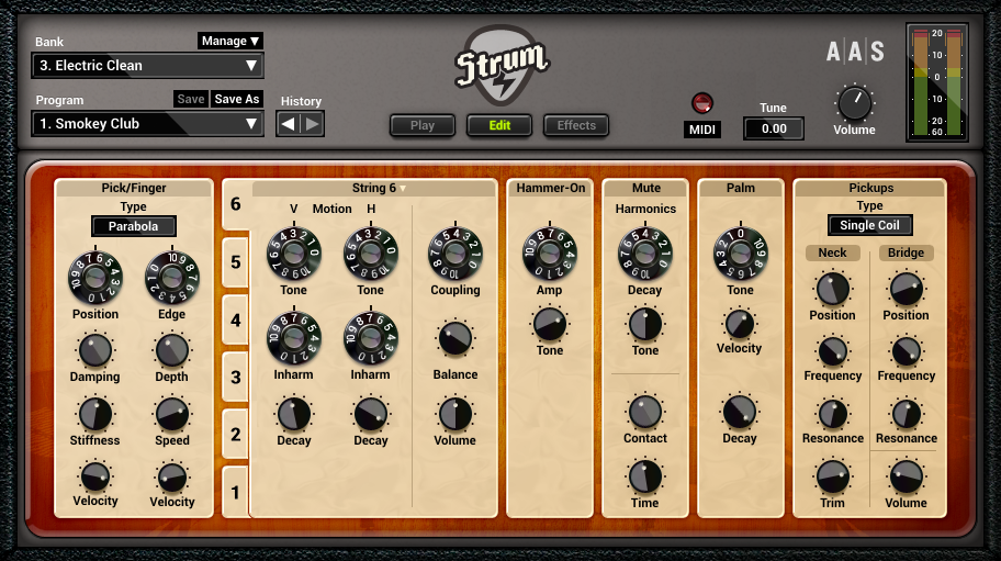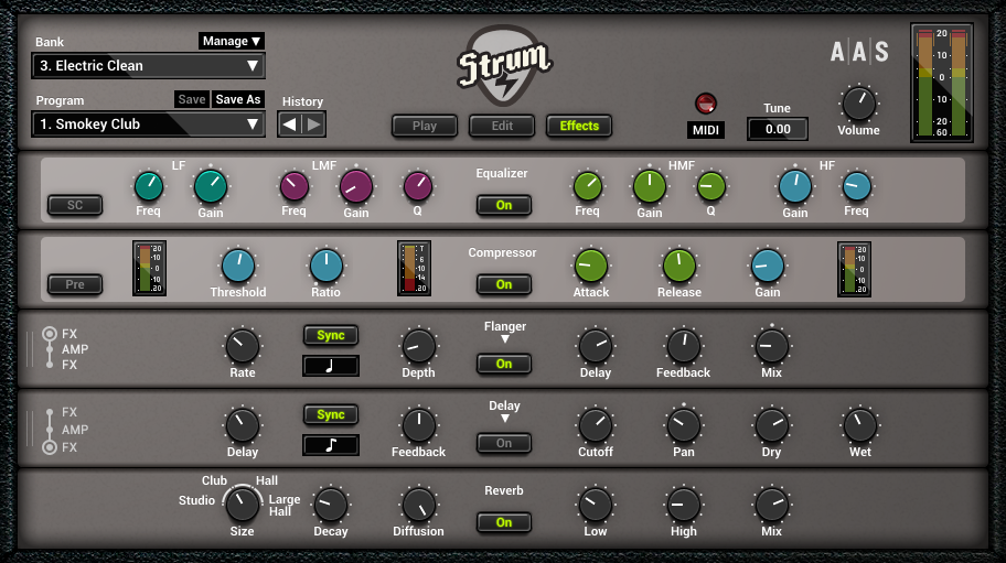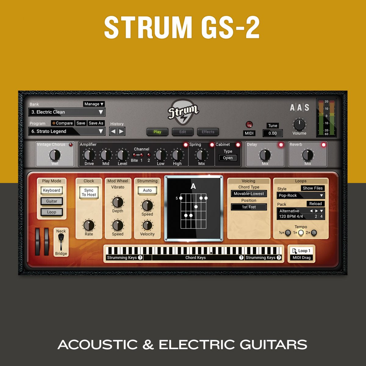 Strum GS-2 er et plugin til produktion af guitarr tracks. Med en imponerende samling af akustiske og elektriske guitarer, automatisk akkordgenkendelse, sofistikeret akkordvoicing, integreret strumming og picking, MIDI riff-bibliotek, forstærker og effekter, har det aldrig været så nemt at spille guitar på et keyboard.