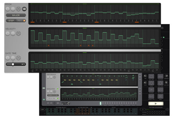 Below the pitch lane, you'll see the Velocity (volume) and Gate Sequencer (controlling each note's length). It's in these top three sections that you'll spend the most of your time, programming riffs and arpeggios, then assigning them to patterns.