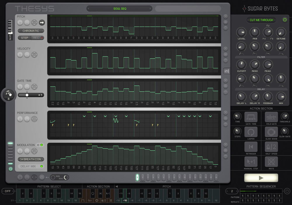 The sequences can simply be painted, but with the random generator and the mutate-function you can easily generate patterns on the fly. Or record the pitch straight from your MIDI keyboard. The internal synthesizer saves you lengthy wiring sessions so you can start straightaway.