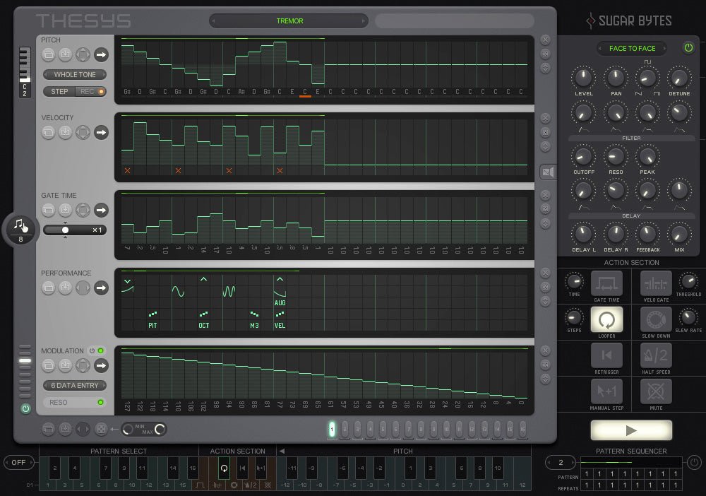 Up to 16 full patterns can be created within a single project. They can can be sequenced within the Pattern Sequencer (bottom right) or triggered via the Keyboard (set to "Pitch"), where the full length of the keyboard is used to transpose the current pattern. Switch to "Performance" and the keyboard is split into 3 zones: Pattern Select, Action Section and a Range for pitch transposing.