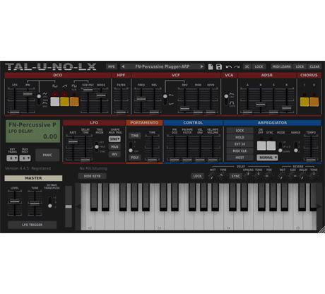 TAL-U-NO-LX est une émulation complètement réécrite du populaire Juno 60 avec un nouveau moteur et une nouvelle interface. Des filtres à retard zéro de rétroaction à jour et des contrôles soigneusement calibrés font de ce synthétiseur un bon remplacement pour l'appareil analogique avec tous les avantages des plugins logiciels. En outre, le TAL-U-NO-LX prend également en charge le portamento et différentes formes d'onde LFO de filtre ainsi que d'autres fonctionnalités utiles. Un arpégiateur avec différents modes de synchronisation et une fonction de maintien est également inclus. Une enveloppe très rapide avec une atténuation douce, une inexactitude émulated et un son de filtre très fluide donnent à ce synthétiseur le son typique. Le synthétiseur a été calibré après un appareil matériel qui appartient à TAL.
