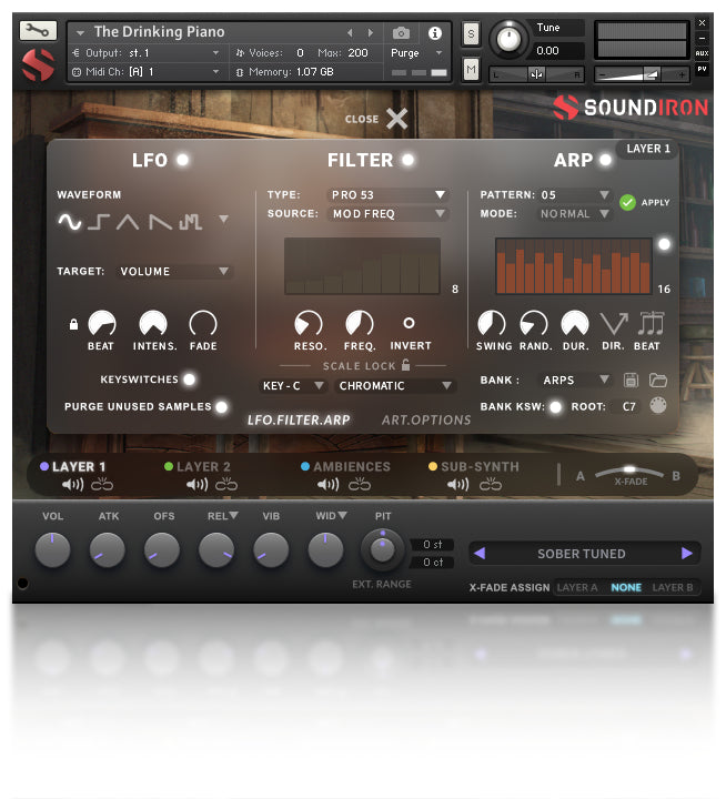 - Flexible and intuitive multi-layer user interface controls, with LFO, filter, glide, and arpeggiator