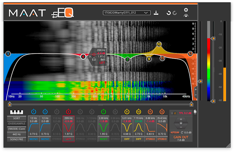 L'idée est née de rééditer ce chef-d'œuvre et de le rendre disponible en 64 bits dans tous les formats courants et pour macOS. Un accord avec Algorithmix a été conclu, et MAAT a démarré à la mi-2017. Les fans d'Algorithmix ont entendu parler de cela et nous ont contactés, disant : “…refaites-le simplement tel quel ; pas d'extras, rien. Nous voulons juste le retrouver en 64 bits et pour Mac.” C'était encourageant. En tant qu'utilisateur avancé, Tischmeyer avait d'autres idées en tête concernant l'interface utilisateur. Il voulait la rendre plus flexible et plus rapide à utiliser, car il n'y a pas d'autre outil dans la chaîne de mastering avec lequel un ingénieur passe autant de temps à configurer. Le résultat ? “Je pense que nous avons réussi. L'interface utilisateur permet une configuration super rapide et possède un certain nombre de fonctionnalités uniques qui aident à le faire : La fonction de Contribution positive et négative incluant la différence absolue, le sonogramme ajustable qui facilite la détection des points d'énergie que vous souhaitez nettoyer, et la possibilité de jouer une note sur le piano que vous avez dans votre tête et de pousser simplement la fréquence respective vers la section de bande active d'un clic droit ne sont que quelques-unes des nouvelles fonctionnalités. Ce que j'aime aussi, c'est que j'ai une vue d'ensemble de toutes les Sections, contrairement à une seule Section à la fois.” Afin de ne pas se retrouver avec un ordre de Section étrange lors de l'utilisation de nombreux filtres, nous avons également ajouté le bouton SORT, de sorte que vos Sections soient toujours en ordre croissant.