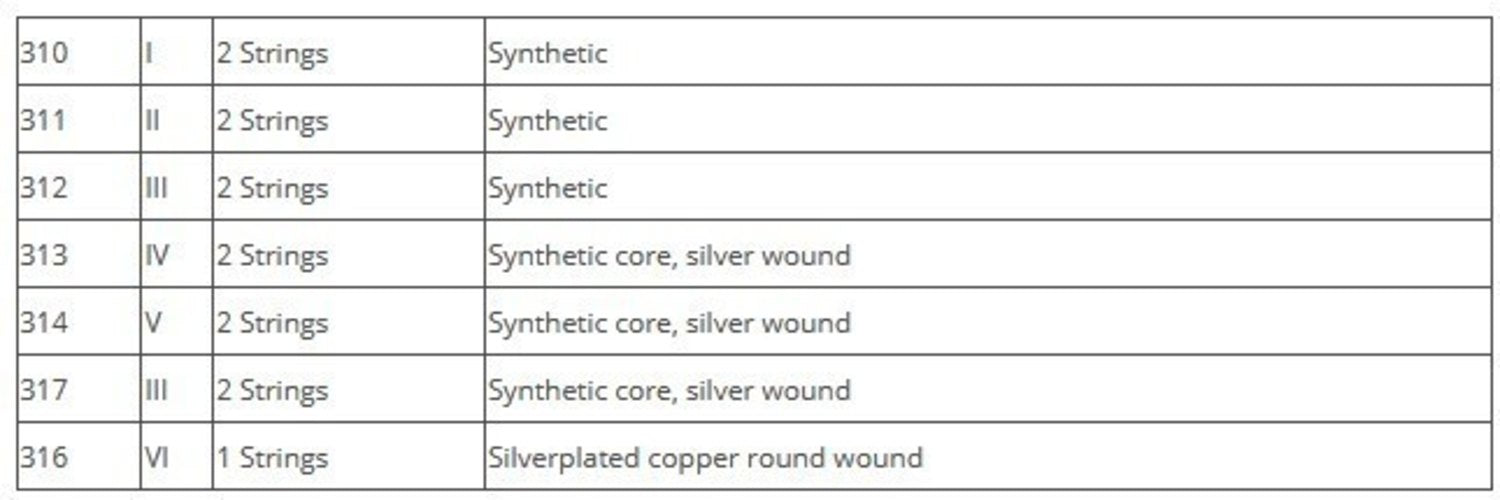 - 10-string set with D String wound (2 each of 310, 311, 317, 313, 314)