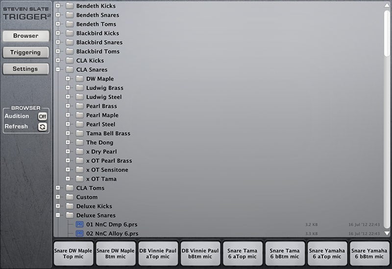 TRIGGER est livré avec une bibliothèque d'échantillons de batterie standard de l'industrie créée par Steven Slate. Des mixeurs d'élite tels que Chris Lord Alge, Ross Hogarth, Justin Neibank, Dave Way, Jeff Juliano, Jay Baumgardner, Ben Grosse, David Kahn, Ryan Williams et bien d'autres noms de premier plan se sont fiés aux échantillons de Slate pour aider à améliorer les sons de batterie dans leurs mixes pendant des années. Tous les échantillons dans Trigger sont enregistrés sur bande de 2 pouces et traités avec le meilleur matériel analogique vintage et moderne. TRIGGER peut également charger des bibliothèques d'expansion telles que Steven Slate Deluxe, Chris Lord Alge, Terry Date, Blackbird studios et David Bendeth.