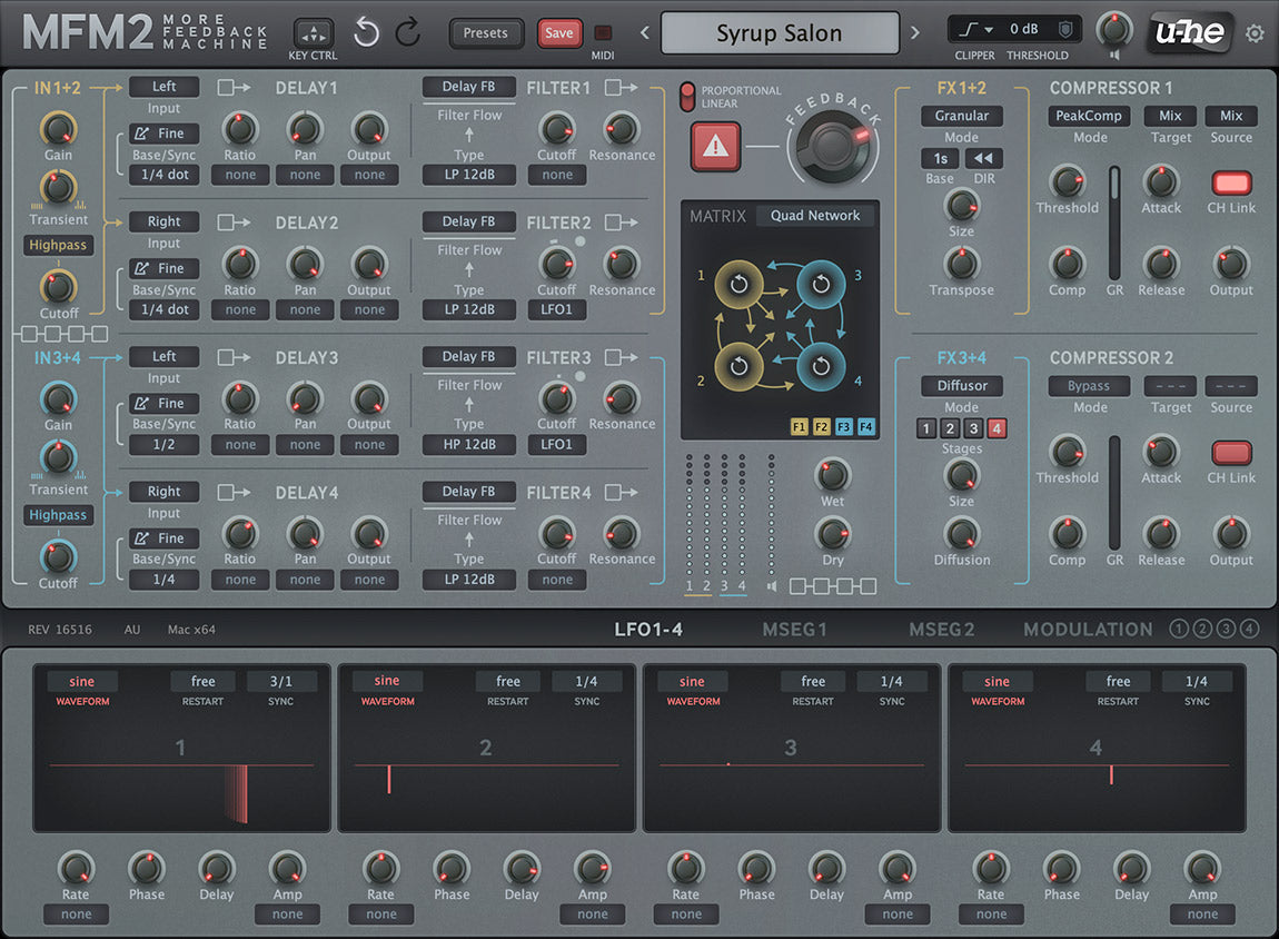 - 4 delay lines with independent absolute time or tempo-synced modes