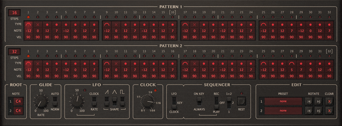 Le séquenceur dans le matériel original était peut-être un coup de génie. La version de Repro-1 vous permet d'enregistrer pas à pas deux motifs de jusqu'à 32 notes chacun, qui sont également sauvegardés avec le preset et supportent le copier/coller des presets de motifs entre différentes instances du plug-in.