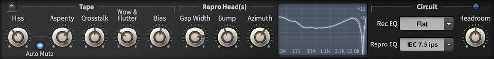 Enfin, la section Circuit vous permet de changer le circuit EQ interne. Sont inclus divers courbes EQ standard de l'industrie, si vous souhaitez imiter des machines spécifiques. Mais Satin va un peu plus loin en permettant la sélection indépendante des courbes EQ d'enregistrement et de reproduction. Que vous pouvez utiliser de manière abusive pour des effets de traitement étranges, ou pour corriger des erreurs d'EQ dans de vieux enregistrements (voir ci-dessous).