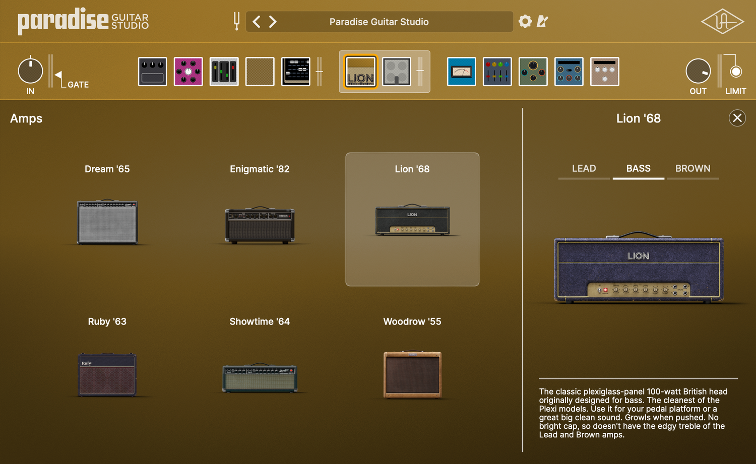 Avec nos meilleures émulations d'amplis — y compris l'acclamé UAD Dream ’65, Enigmatic ’82, et plus encore — Paradise est comme être dans une pièce pleine d'équipements iconiques. Profitez de riches tonalités vintage, avec toute la sensibilité au toucher et le "sag" à lampes que les guitaristes professionnels désirent. Que vous ayez besoin de sons clairs scintillants, d'overdrive naturel, ou de sons boutique rares, vous pouvez régler ce que votre morceau nécessite.