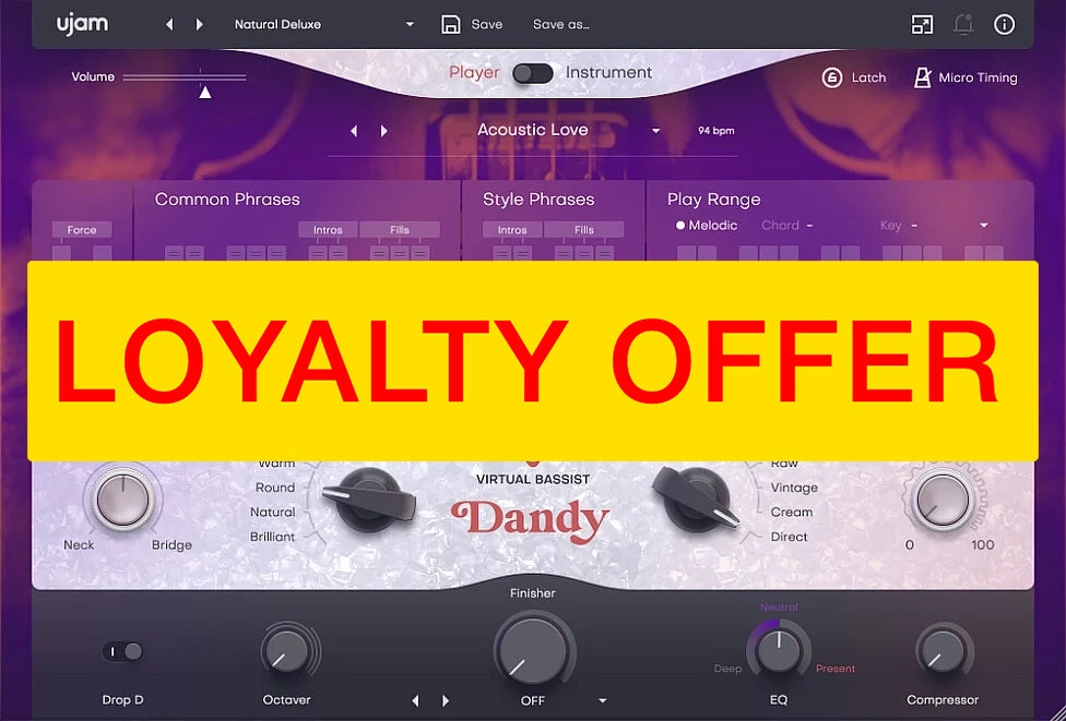 DANDY est votre premier choix lorsque vous avez besoin d'un bassiste professionnel expérimenté qui est totalement présent dans un mix sans jamais sonner "bruyant" ou odieux. Il n'y a aucune agressivité ou attitude "peu importe" du rock indie dans le jeu. Non, DANDY pose discrètement des lignes de basse ultra-douces et très polies sans voler la vedette ou prendre trop de place dans un mix. Comme c'est civilisé !