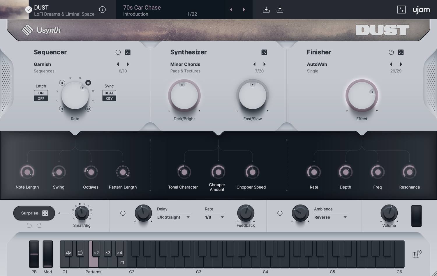 DUST est tout au sujet de tons poussiéreux et magnifiquement vieillis. Il commence par des sources d'instruments acoustiques et électriques, puis les dégrade, les filtre et les distord en une perfection liminale/loFi au-delà du rétro — le genre de caractère qui fait que tout sonne magnifiquement usé et vivant.