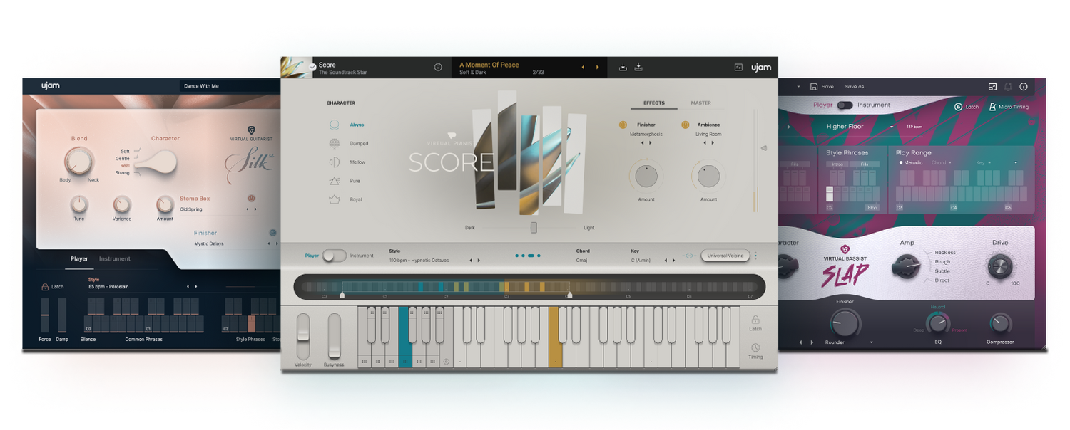 Le Pianiste Virtuel SCORE offre des performances de piano cinématographiques, tandis que le Guitariste Virtuel SILK 2 joue des parties de guitare acoustique au son professionnel. Ajoutez de l'énergie avec les styles funk dynamiques du Bassiste Virtuel SLAP.
