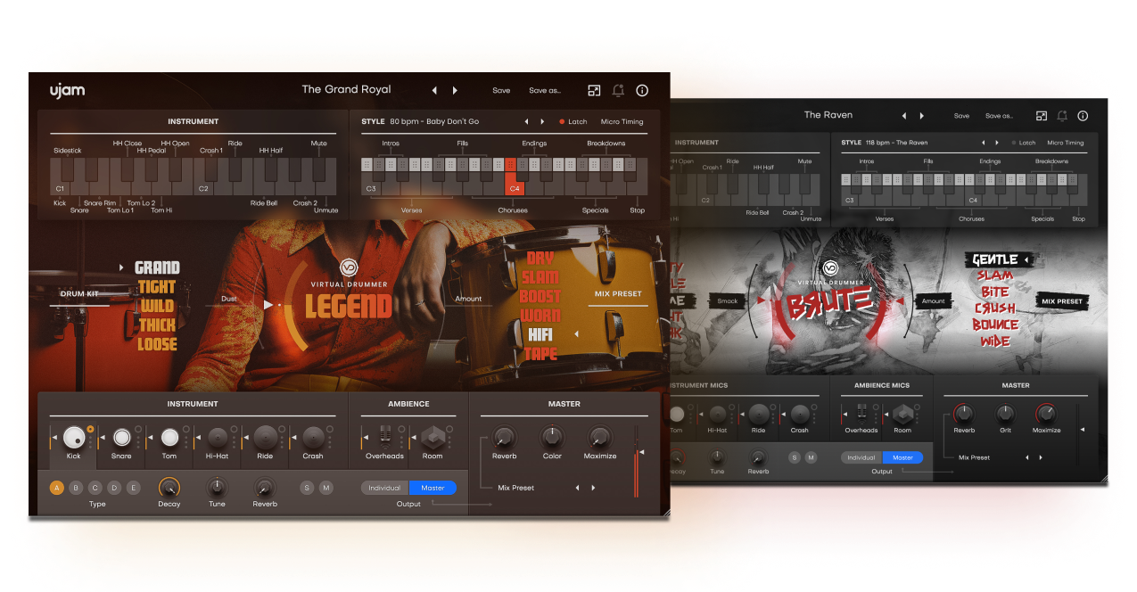 Créez de l'excitation avec les sons rock classique du Batteur Virtuel LEGEND ou produisez des beats lourds avec le Batteur Virtuel BRUTE. Les deux offrent des grooves authentiques de qualité studio en quelques secondes.