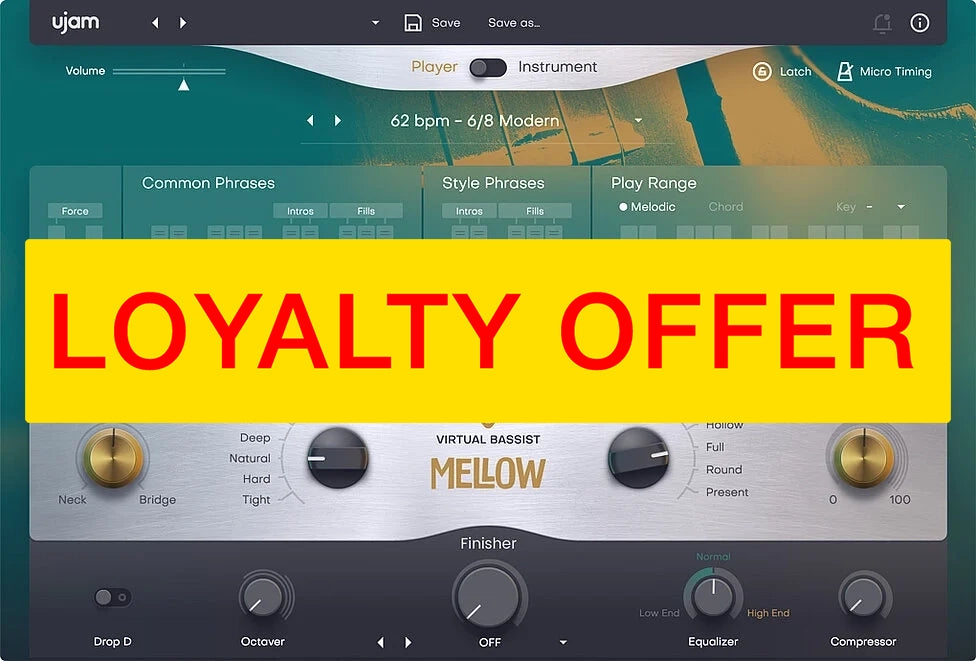 Virtual Bassist MELLOW a deux modes distincts – Tout d'abord, le Mode Joueur, qui vous donne un accès facile à l'interface graphique sans échec traditionnelle de UJAM et à l'ensemble de contrôle, il suffit de définir la tonalité musicale et de décider des accords de la chanson et MELLOW fait le travail difficile, choisissant même intelligemment les articulations les plus appropriées pour compléter vos lignes de basse.
