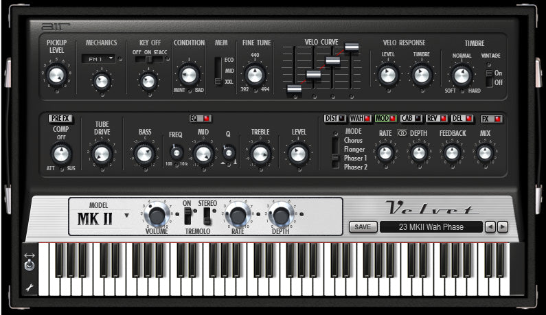 Velvet er et virtuelt elektronisk klaver, der kombinerer fem legendariske elektriske klaverer fra 60'erne og 70'erne i ét alsidigt instrument.