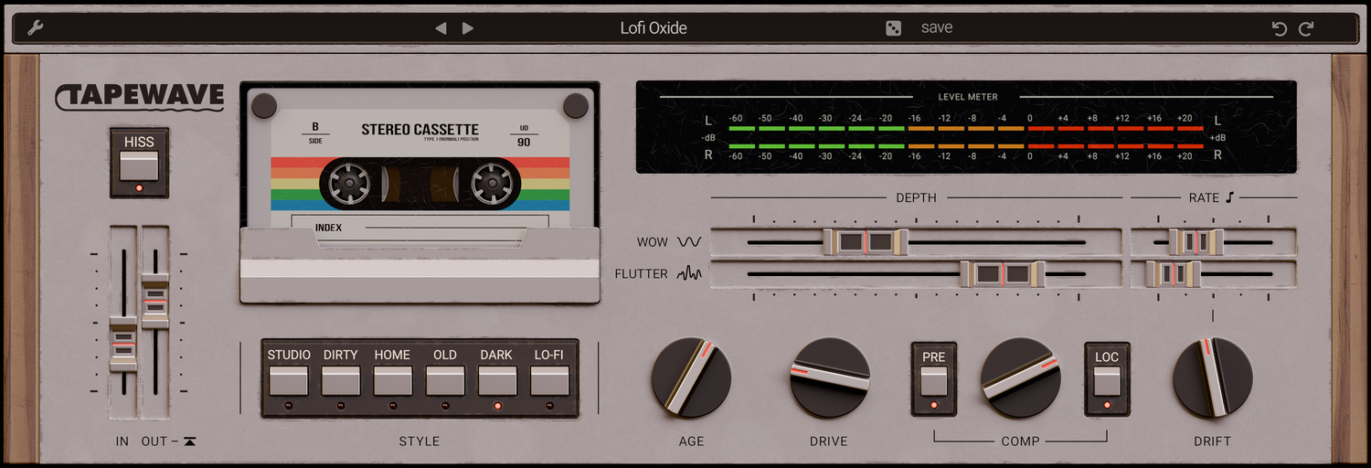 De la douceur analogique subtile à la nostalgie grinçante et vibrante, Tapewave recrée sans effort les empreintes sonores des véritables machines à cassette — avec une saturation riche, une compression vibrante, du wow & flutter, et six styles de bande distincts. Avec son réglage d'âge de bande ajustable, vous pouvez dégrader ou affiner le ton à la perfection — que vous recherchiez chaleur, saleté ou pure bizarrerie rétro.