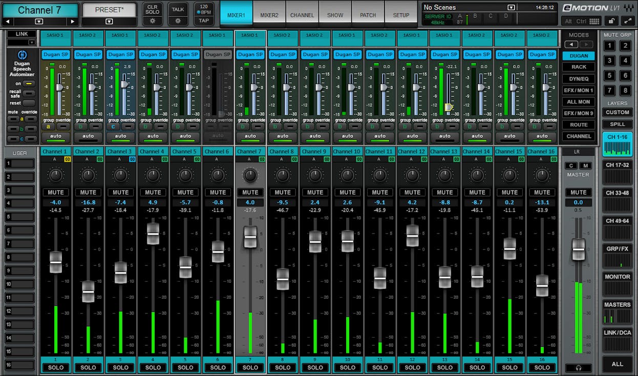 C'est ici que le Dugan Speech auto-mixer entre en jeu. Développé avec l'inventeur audio Dan Dugan, le Dugan Speech contrôle le gain automatiquement, en temps réel. Oubliez les cauchemars de la gestion de plusieurs microphones—vous pouvez maintenant gérer jusqu'à 64 micros en toute confiance.