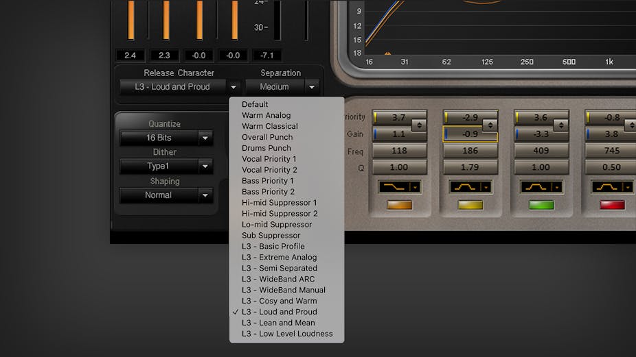 Il n'y a rien de tel que le L3-16. Fusionnant l'égaliseur paragraphique et le contrôle de la dynamique, les affichages informatifs montrent 16 bandes virtuelles, avec une réponse représentée par trois courbes discrètes—atténuation, EQ, et priorité. Et tout cela est sous contrôle intuitif, grâce à un ensemble de contrôles d'égaliseur paragraphique familier.