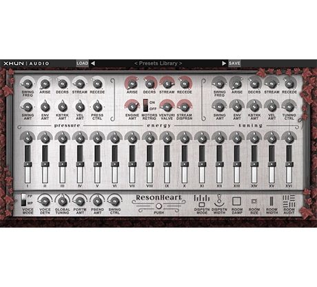 Construit comme un instrument virtuel grâce à l'utilisation de techniques de modélisation physique (ACS), ResonHeart doit être considéré comme une machine acoustique née naturellement, composée de composants d'horlogerie, de pompes à air, de moteurs, de vannes pneumatiques et de blocs de résonateurs complexes (un par voix). Chaque bloc de résonateur se compose d'un ensemble de seize résonateurs de Helmholtz universels (qui peuvent être déclenchés et accordés individuellement) disposés dans une configuration de synthèse modale caractéristique. Ce design particulier rend ResonHeart véritablement capable d'imiter le son particulier d'une large gamme de systèmes acoustiques, y compris les percussions et cymbales à corps rigide ou à membrane - l'une des choses les plus difficiles à simuler en utilisant la modélisation physique.
