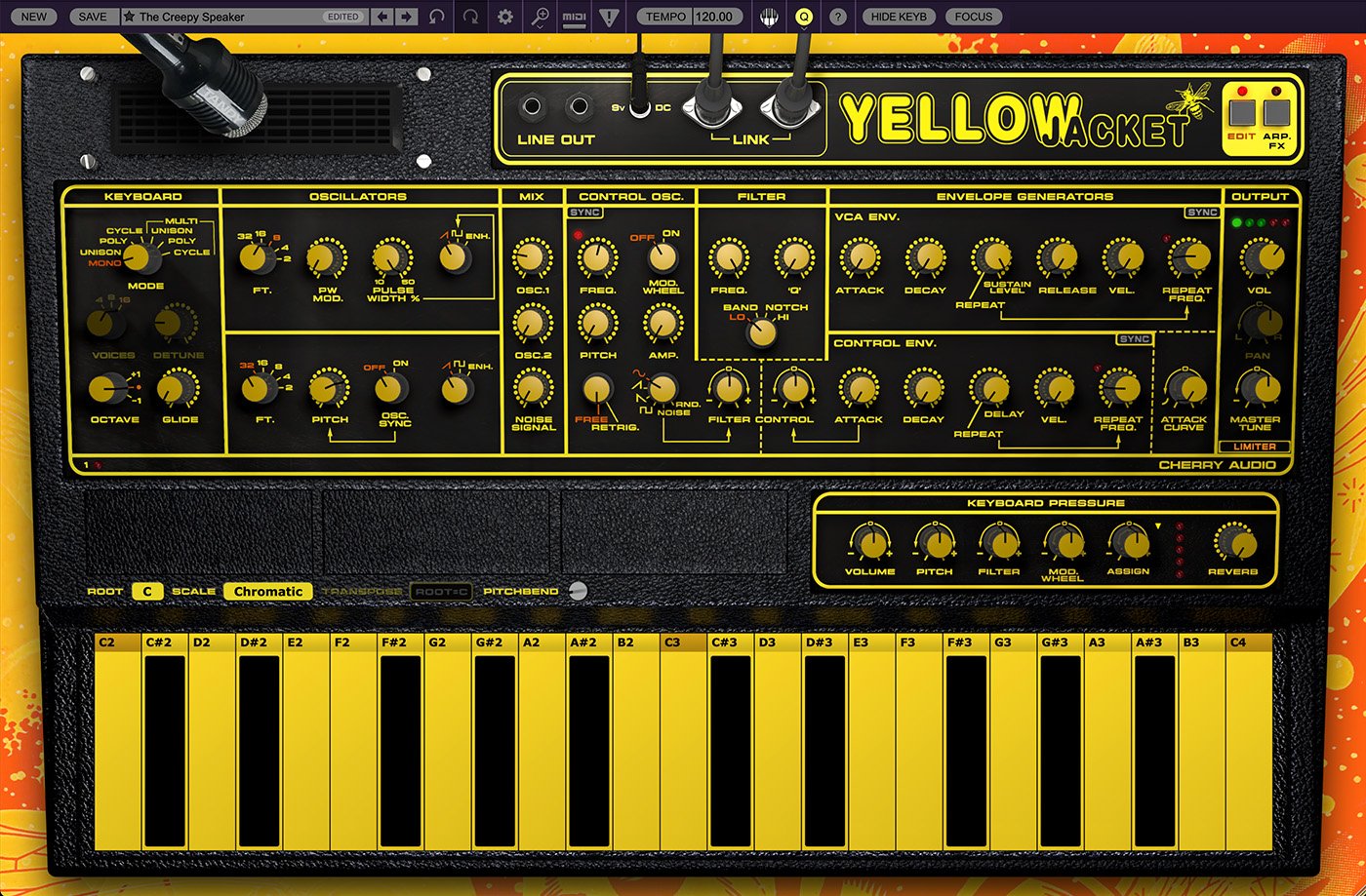 Cherry Audio a répliqué l'apparence du célèbre clavier tactile capacitif jaune et noir de l'original, l'a amélioré avec des gammes diatoniques et une fonction de transposition, et l'a étendu avec un contrôle de pression personnalisable, prenant en charge l'aftertouch de canal expressif et polyphonique. Peut-être que la fonctionnalité la plus excitante du Yellowjacket est directement inspirée par le système pré-MIDI innovant d'EDP qui permettait de chaîner plusieurs synthétiseurs : des modes multi-voix qui ajoutent des "mini synthétiseurs" ajustables pouvant fournir des variations subtiles ou extrêmes de ton, des accords à un doigt et des motifs arpégés, des effets stéréo luxuriants, et plus encore.